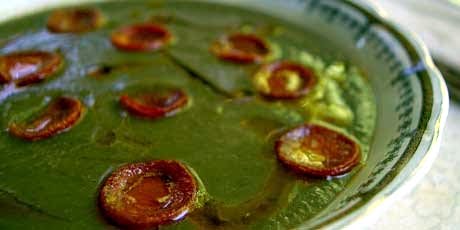 Heat the olive oil in a small frying pan and sauté the chorizo slices until they curl, about 30 seconds. Turn and fry another 15 seconds. Serve the soup with chorizo rounds on top and with some of the now bright-orange cooking oil spooned around.