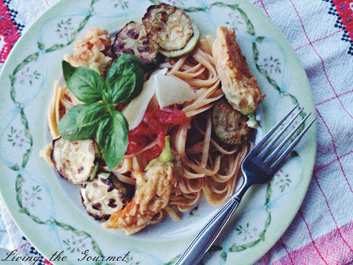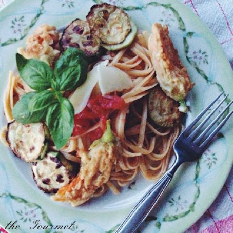 Lemon Fresh Spaghetti with Garden Sauce & Pumpkin Flowers