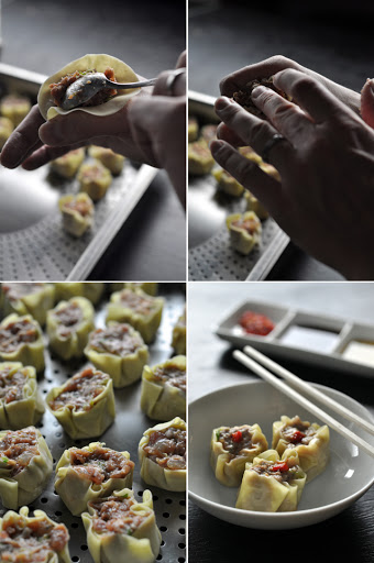 6. To finish squeeze with your thumb and index fingers to form the round cylinder shape while flattening the top of the siu mai.