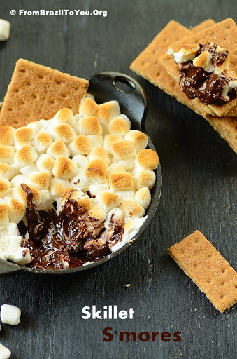 Bake until marshmallows are browned and chocolate is melted, about 4-5 minutes, as follows: The first 2-3 minutes, loosely cover skillet with a sheet of aluminum foil (tented so that it will not stick to the marshmallows)... Then, remove aluminum foil for the last 2 minutes so that marshmallows can brown. Let stand for approximately 4 minutes before serving with the crackers on the side. Enjoy! If you are serving this Skillet S'mores for one to a couple of people, you can decrease the ingredient amounts by half like I did, and use a smaller skillet.