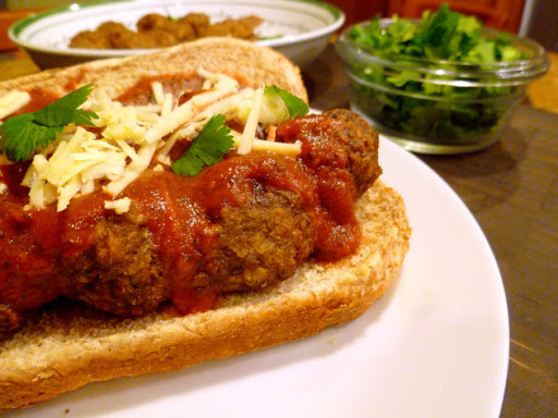Cut buns in half, horizontally. Place bun halves side by side on a baking sheet. Cut 5 or 6 meatballs in half and pile on buns. Ladle approximately 1 cup of sauce on top of meatballs. Put as much of the grated mozzarella cheese on top that will stay and lightly sprinkle with oregano and basil. Put the baking sheet in the oven and bake until the cheese has melted and the edges of buns are nicely toasted.