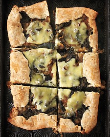 To assemble: Roll out each piece of dough to an 11-by-14-inch rectangle on lightly floured parchment, and transfer to 2 baking sheets. Divide filling between rectangles, leaving a 2-inch border all around. Season filling with salt, and fold in edges of dough. Refrigerate 1 tart, and bake the other until edges are golden, about 35 minutes. Place half the cheese on top of filling, and bake until cheese is melted, 5 minutes more. Bake remaining tart in same manner. Serve tarts warm or at room temperature.