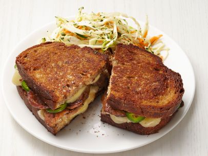 Spread the mustard on the bread, then sandwich with half of the cheese, the kielbasa, jalapeno and the remaining cheese.