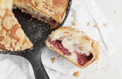 Remove dough to a floured surface and roll in to a rectangle roughly 16 inches long by 10 inches wide. Spread your (cooled) strawberry compote over the surface, leaving a 1 1/2-inch margin around all sides uncovered. Starting with the long side, begin to roll dough by folding over the edge, then gently lifting up and then dropping the dough forward (rather than rolling). Pinch the open ends together as you go to avoid filling coming out the ends. As you near the end, rather than rolling the turn, pull the bare edge up towards you and pinch the dough together along the length. Rotate your dough so the seam is down.
