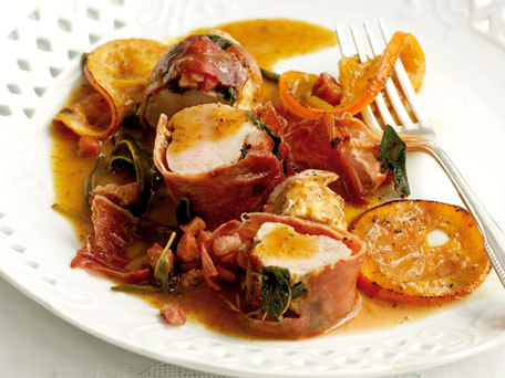 Using a pan, fry until golden brown, turning a couple of times. Remove then place on a baking tray and bake in the oven for 5 minutes. Add to the reserved pancetta-and-sage pan juices the orange juice, remaining mustard and sliced orange, then reduce slightly. Add butter to thicken.