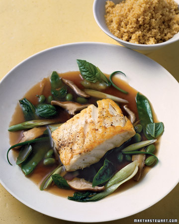 To pan, add ginger, bok choy, edamame, shiitakes, and snow peas; reduce heat to medium and cook, stirring constantly, for 3 minutes or until the shiitakes begin to soften. Add green tea, soy sauce, and honey. Cook until edamame are tender, about 3 minutes longer. Add scallions to pan. Place some broth and vegetables in each of four shallow bowls. Top with fish fillet and garnish with basil leaves.