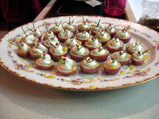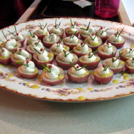 For garnish, top each potato with 1 pink peppercorn and 2 chive pieces. Serve at room temperature.