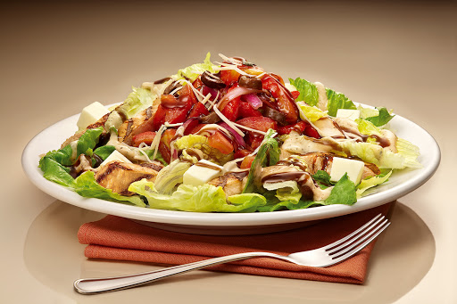 Place lettuce on a large plate or in a large bowl. Add bruschetta topping and chicken. Sprinkle with Parm-style topping, and top with string cheese coins.