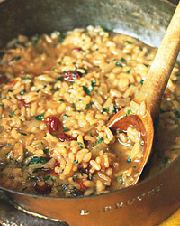 Add the sun-dried tomatoes and about 1/2 cup of the simmering broth to the rice and cook, stirring frequently, until the broth has been completely absorbed. The rice and broth should bubble gently; adjust the heat as needed. Continue cooking the rice, adding broth 1/2 cup at a time and allowing the rice to absorb the broth before adding the next 1/2 cup. Cook the rice in this way until tender, 25 to 30 minutes in all. The broth that hasn't been absorbed should be thickened by the starch from the rice. You may not need to use all of the liquid, or you may need more broth or some water.