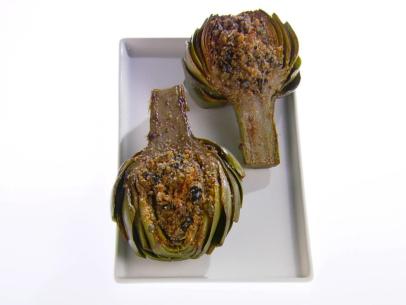 - 2 large or 3 medium 10-ounce artichokes, trimmed, thorns removed, halved lengthwise and chokes removed