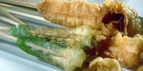 4. Dip the vegetable skewers in the batter. Fry 5 or 6 skewers at a time, letting the ends stick out. Fry until golden, 3 to 4 minutes. Cool slightly on the rack before serving.