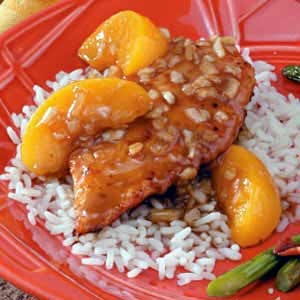 Stir in gelatin and peach; mix well. Set aside 1 cup for serving. Grill chicken, uncovered, over medium heat for 3 minutes on each side. Baste with some of the remaining peach sauce. Continue grilling for 6-8 minutes or until meat juices run clear, basting and turning several times.