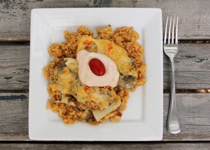 Brown the ground beef and drain. Add half the enchilada sauce, the green chiles, red pepper flakes, and garlic, pepper and salt to taste.