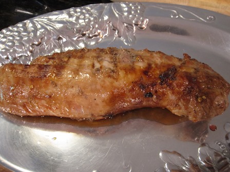 Grill on BBQ over low heat, turning regularly and basting with marinade until internal temperature reaches 160 (about 25 minutes). Let stand for several minute; slice and serve.