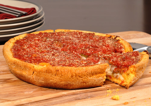The secret to the dough is a process known as laminating the dough, which is similar to how you make croissants (although not nearly as involved or time-consuming). You basically roll out the dough, slather it with lots of butter, and then roll it and fold it in such a way that the butter ends up in thin layers within the dough, which creates a wonderfully flaky texture – one of the key components to a great deep-dish pizza.