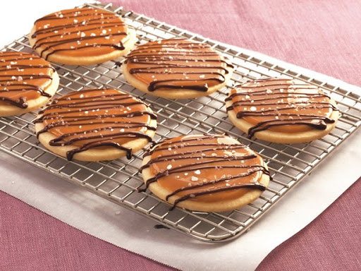 5 In small microwavable bowl, melt chocolate and 1 tablespoon butter uncovered on High 1 minute 30 seconds, stirring every 30 seconds, until melted and smooth. Drizzle chocolate over caramel on each cookie. Sprinkle generously with salt. Let stand until set.