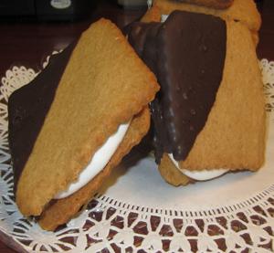 Work quickly to pipe the marshmallow onto the entire surface of the baked and cooled graham cookies.