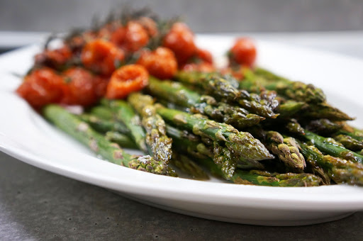 Combine 1 pound trimmed asparagus, 1/2 cup cherry or grape tomatoes, 1/3 cup sliced shallots, 1 1/2 tsp chopped fresh thyme, 1/4 tsp salt, and 1/4 tsp pepper on a jelly-roll pan.