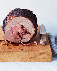 Transfer the skillet to the upper third of the oven and roast the meat for 1 hour, until an instant-read thermometer inserted in the center registers 130°. Transfer the roast to a carving board and let rest for 10 minutes. Discard the twine. Using a thin, sharp knife, thinly slice the beef across the grain and serve.