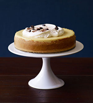 6. Remove side of pan. Whip cream and sugar to stiff peaks. Garnish cheesecake with whipped cream. Scatter top with coffee beans and dust with cocoa powder, if desired.