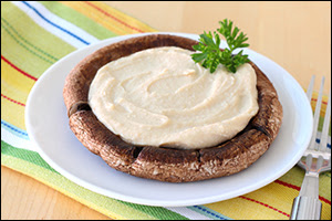 Preheat your oven to 400 degrees. Place 2 portabella mushroom caps, rounded sides down, on a baking sheet sprayed with nonstick spray. Bake until softened, about 12 minutes. Blot away excess moisture and let cool, about 20 minutes. Spread each one with 2 tbsp. natural hummus, and eat!