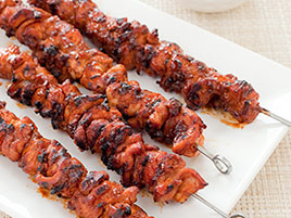 To ensure that the meat in our barbecued chicken kebabs recipe stayed moist, we started by tossing the chicken pieces with salt. After allowing the salt to penetrate the meat, we coated it in sugar, spices, and pureed bacon, which kept the chicken kebabs moist and flavorful as they cooked. We grilled each side of the kebabs until the meat was almost fully cooked and then brushed our prepared barbecue sauce recipe onto the kebabs, leaving them on the grill until the sauce had a chance to caramelize.
