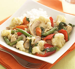 2. Sprinkle chicken with salt and pepper. Place chicken in slow cooker with cauliflower and carrots. Pour curry mixture on top and cover. Cook on HIGH for 3 hours or on LOW for 5 hours or until internal temperature of chicken registers 160 degrees on an instant- read thermometer.