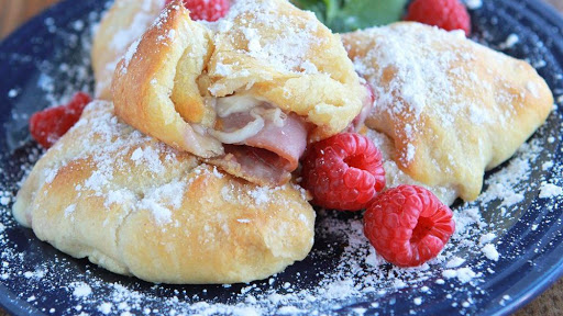 Unroll dough; separate into 8 triangles. Spoon 1/2 tablespoon raspberry jam on wide end of each triangle. Top each with ham and cheese. Carefully fold edges of triangles into center, pinching edges closed and gently forming dough into triangle over filling. Place on ungreased cookie sheet.