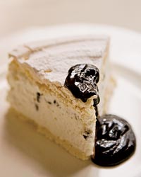Using a serrated knife, cut the frozen cake into wedges and transfer to plates. Let stand for 10 minutes. Spoon some of the sauce on each wedge and serve.