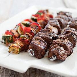5. Place meat skewers in center of grill directly over coals and vegetable skewers near edge of coals but still over fire. Grill beef skewers until well browned, slightly charred, and instant-read thermometer inserted into center of meat registers 125 degrees for medium-rare, 12 to 16 minutes, turning every 3 to 4 minutes. Transfer beef skewers to serving platter, loosely tent with foil, and let rest 10 minutes. Continue to grill vegetable skewers until vegetables are tender and slightly charred, about 5 minutes longer (17 to 21 minutes total), turning every 4 to 5 minutes. Transfer vegetables to platter with beef. Remove beef and vegetables from skewers and serve.
