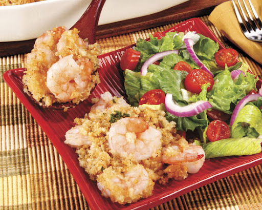 Preheat oven to 350°. Spray the bottom of a 9x13 pan with nonstick cooking spray. Combine all of the ingredients except the shrimp to make the topping. Place the shrimp in the pan and cover with topping. If using raw shrimp cook for 20 minutes. If using cooked shrimp bake for only 10 minutes.