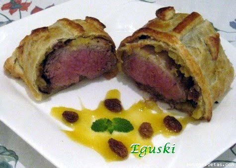 Con un rodillo, estiramos bien el hojaldre, colocamos sobre el la mezcla de manzana y pasas, encima el solomillo, lo cerramos bien, lo pincelamos con huevo batido, metemos al horno precalentado a 180º unos 20 min. aprox