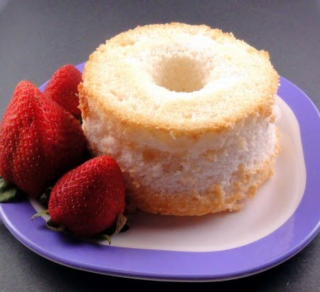 I decided to use the recipe for a regular size angel food cake, but only made 3/4 of the recipe to be used in (4) 2×4-inch size pans and the batter came up to about 3/4 of the mini pans. This recipe below actually had measurements that was flexible enough for me scale down. I skipped the lemon juice and opted to use vanilla extract instead. I reduced the baking time to approximately 27 min and they were cooked just perfect. (I set my timer at 30 min, but I started checking around 20 min).