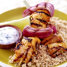 Grill skewers, turning often, until chicken is no longer pink in center, about 7 to 9 minutes. Serve skewers over couscous with sauce on the side. Yields 2 skewers, 1/2 cup of couscous and about 1/4 cup of sauce per serving.