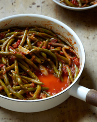 Pour the diced tomatoes and their juices into the skillet and bring to a boil. Reduce the heat to low, cover the skillet and simmer, stirring occasionally, until the green beans are very tender, about 40 minutes. Season the braised green beans with salt and pepper. Transfer them to a platter and serve warm or at room temperature.