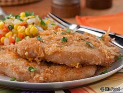 Place pork chops between two sheets of heavy-duty plastic wrap, and flatten to 1/4-inch thickness, using meat mallet or rolling pin. Combine cheese and breadcrumbs. Dip pork chops in milk, and dredge in breadcrumb mixture.