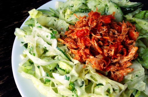 Assemble: Toss the salad with the ranch dressing — I started with two tablespoons of dressing and added just a little at a time until the vegetables were coated but not swimming in dressing. Toss for at least two minutes for maximum coverage. Divide the salad between plates and top with a mound of Buffalo Chicken. Dig in!