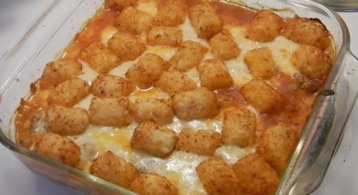 Transfer to a greased 13x9-in. baking dish. Top with cheese and potatoes. Bake, uncovered, at 400° for 30-35 minutes or until golden brown.