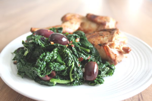In a large pot of boiling water, cook the kale until tender, about 3-5 minutes. Drain and shake off excess water. Heat a little bit of olive oil in a skillet and add shallot and garlic. Saute a few minutes then add kale, olives and red pepper flakes. Saute a few minutes more then finish by squeezing juice from the grilled lemon on top.