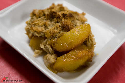 Top peaches with half of the crumb topping. Place in oven and immediately reduce oven temperature to 350 degrees F. Bake uncovered for 30 minutes, then add remainder of the crumb topping. Reduce heat to 325 degrees F and bake until golden and bubbling, another 45 minutes. Remove from oven and let sit for 15 minutes before serving.