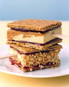 2.Break graham crackers in half to make 2 1/2-inch squares. Spread one side of each with about 1 1/2 teaspoons jam; freeze until firm, about 45 minutes (this keeps finished pops neat). Sandwich ice-cream squares between graham crackers, jam facing ice cream. Insert a wooden pop stick into each.