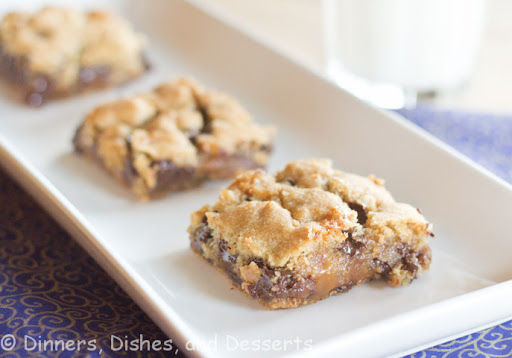 Press ½ of the cookie dough into the bottom of the 13x9 pan. Pour the Biscoff caramel mixture over the dough, and spread evenly. Drop small balls of the remaining cookie dough over the caramel, until mostly covered. Bake for about 25 minutes or until the edges are golden, and the center is done. Cool completely before cutting into squares.
