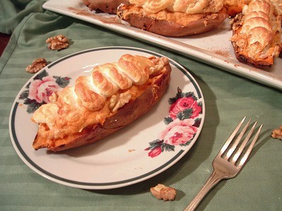 Place stuffed sweet potatoes back into the oven and bake for about 15 minutes or until the meringue starts to turn golden brown. Remove and serve hot topped with walnuts or pecans if desired.