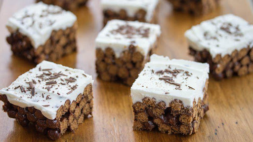 4 Spread frosting over cereal bar base. Sprinkle with chocolate shavings. Store covered in refrigerator. For bars, cut into 4 rows by 4 rows.