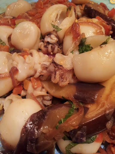In a 12 inch to 14 inch saute pan, heat together oil, onion and garlic over medium high heat until soft, about 8 to 10 minutes. Add eggplant and cook until just softened. Add tomatoes and lemon and season with salt and pepper and cook until they fall apart, about 4 to 5 minutes. Add calamari, season again, and cook until just opaque, about 2 minutes per side. Add basil and toss. Arrange on platter and serve.