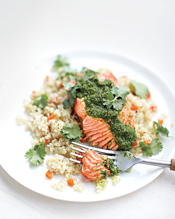 Lift fish out of steamer. Serve over quinoa. Spoon cilantro sauce on top and garnish with fresh cilantro leaves.