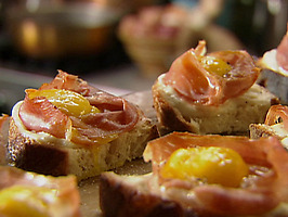 Lay bread out on a sheet tray and drizzle with olive oil, season with salt and pepper and toast lightly. Spoon a dollop of bechamel onto each toast. Arrange 2 slices of ham on each slice of toast and nestle it into a nest shape so the egg will rest in the center. Crack egg and drop into nest on each toast. Bake in oven until eggs are just cooked but the yolk is still slightly runny, about 10 minutes. Season with salt and pepper, if needed.