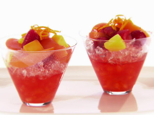 Poached Strawberries, Peaches, and Mango over Crushed Ice