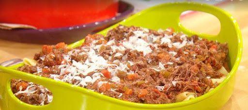 Remove the excess fat that has floated to the top and solidified. Remove the short ribs from the sauce, take the meat off the bones and shred with two forks or with your fingers. Add the meat back into the sauce and discard the bones. Place the pot over medium heat to bring up to temperature.