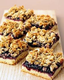 An almond crust is spread with blueberry jam and topped with crumbles of homemade granola.